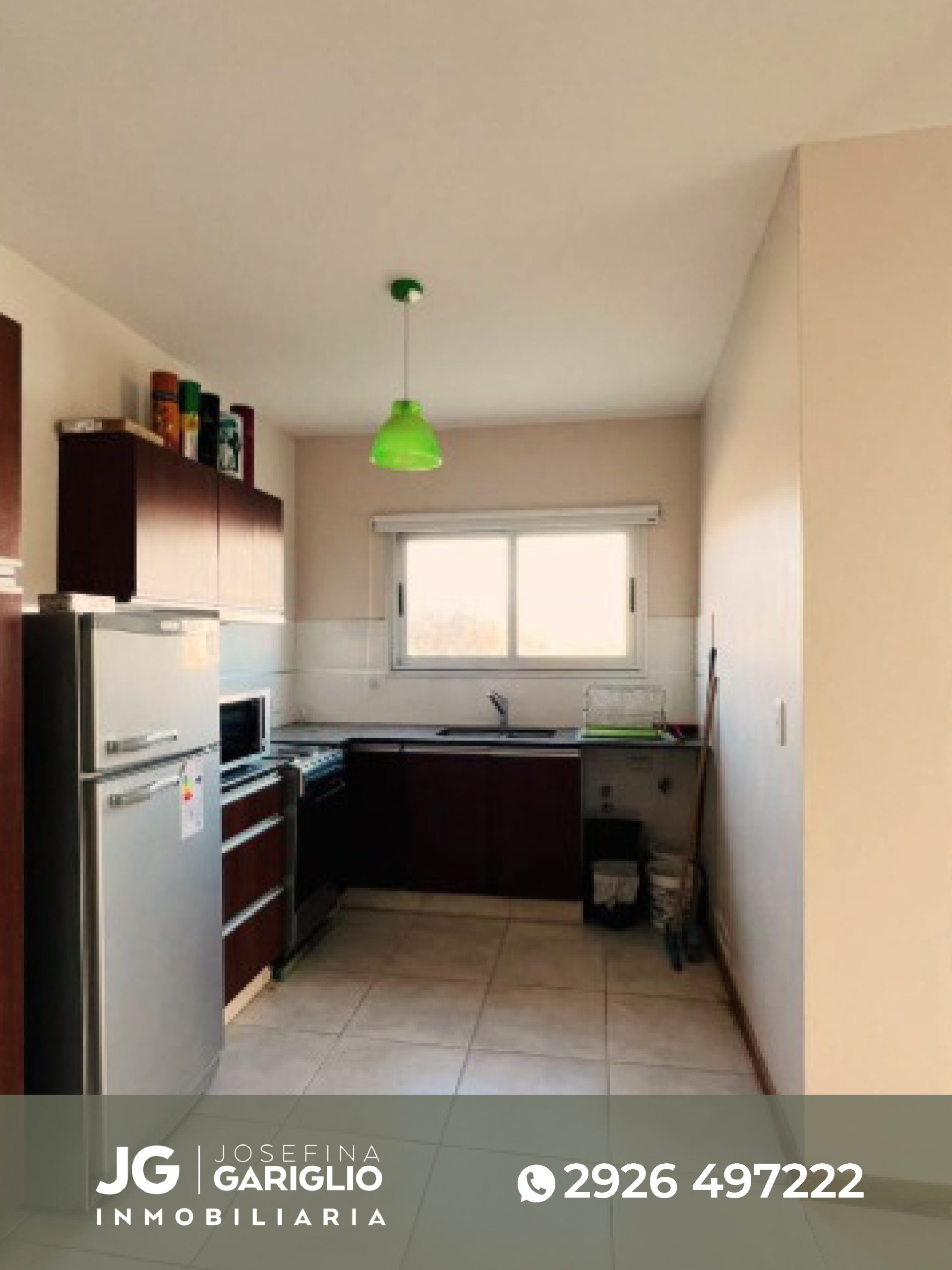 Cocina semintegrada, equipada con alacenas, bajo mesada y electrodomésticos nuevos.
